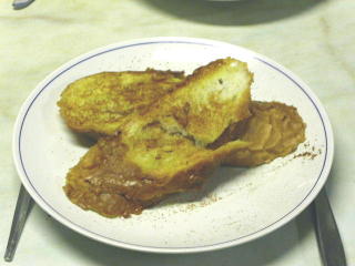 【使った道具】 バット フライパン 【材料】 フランスパン・バケット 適度な大きさのスライス 4枚 卵 1個 牛乳 適量 砂糖 適量 バナナ 1本 ブランデー または ラム酒 大さじ1 砂糖 大さじ1 蜂蜜 適量 バター 少々 【作り方】 1、バナナをよく潰し、ブランデーを加えておきます。 2、フライパンに砂糖をいれ、火にかけてカラメルを作り、先ほどのバナナと蜂蜜をいれ、焦げない程度に炒めます。 3、4枚にスライスしたフランスパンの間をパンがはがれない程度にスライスし、そこに炒めたバナナを挟みます。 4、バットに卵・砂糖・牛乳を入れて混ぜ、バナナを挟んだパンに卵液をしみこませます。 5、フライパンにバターをいれ、きつね色になる程度にパンを焼けば出来上がりです。 |