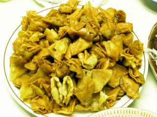 【使った道具】 中華鍋 小型ボール 【材料】 ワンタンの皮 40枚程度 豚肉:牛肉=3:7 豚牛合挽き肉 100g〜150g 清湯(チンタン) 小さじ1 料理酒 少々 塩 少々 A コショウ 少々 ごま油 少々 鶏がらスープの素 少々 しょう油 少々 揚げ油 適量 【作り方】 1、ボールに合いびき肉をいれ、適度な硬さが残る程度に混ぜます。 2、そこにAを加えてよく混ぜ、ワンタンの中心に少量のせていきます。 3、半分にたたみ、また半分にたたんで、扇の形になるようにワンタンをつくります。 4、中華鍋に油を注いで熱し、強火でカリッとワンタンを揚げれば出来上がりです。 |
