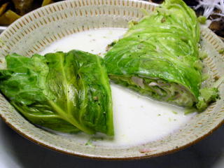 【使った道具】 ジップロック(なければラップ) 電子レンジ対応の深皿 【材料】 キャベツ 5枚程度 カマンベールチーズ 適量 ベーコン 3枚 塩 少々 コショウ 少々 粉末ブイヨン 少々 牛乳 200cc 生クリーム 50cc または バター 5g お好きな風味が選べます。 【作り方】 1、まな板などでキャベツの葉に塩・コショウ・粉末ブイヨンを軽く味が付く程度振り、よくもみます。 2、ジップロックに先程のキャベツを入れ、しんなりするまで電子レンジにかけます。(大体5分程度) 3、しんなりしたキャベツの間にベーコンやチーズを巻き込みながら、大きな一塊を作ります。 4、深皿にロールキャベツをのせ、牛乳・生クリーム(バター)をかけて、5〜8分程度電子レンジにかけます。 このとき、皿にふたをしないほうが良いでしょう。ふたをしないことで、出来上がりの色が良くなります。 5、切り分けて、キャベツがしんなりし、チーズが溶けていれば、出来上がりです。 |