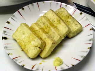 【使った道具】 フライパン 粉をつけるための小皿 ペーパータオル 小型の鍋 【材料】 焼き豆腐 1丁 小麦粉 適量 片栗粉 適量(小麦粉の1/2程度) 青海苔 少々 しょう油 大さじ3 砂糖 小さじ1 みりん 大さじ1 水 少々 揚げ油 適量 【作り方】 1、豆腐のパックから取り出し、ペーパータオルなどで押さえながら、水気をよく切ります。 2、豆腐を適当な大きさに切りそろえ、小麦粉・片栗粉・青海苔の入った容器に入れ、良く豆腐にまぶします。 3、フライパンに油を注ぎ、180℃まで熱します。 4、その間、鍋に調味料類をいれ、火にかけて溶かし、混ぜておきましょう。 5、粉をまぶした豆腐を熱した油にいれ、きつね色になるまで良く揚げます。 6、器に盛りつけ、たれをかければ出来上がりです。 お好みで生姜を添えると、料理が引き立ちますよ。(^^♪ |