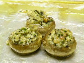 【使った道具】 フライパン アルミホイル オーブントースター 【材料】 マッシュルーム 6個 バター 適量 オリーブオイル 少々 冷凍むきえび 4尾 カニ 少々 なければ、カニ風味かまぼこを使ってください 玉ねぎ 1/8個 にんにく 1片 マヨネーズ 大さじ2 バジル 少々 塩 少々 コショウ 少々 【作り方】 1、マッシュルームの芯を取り、芯と玉ねぎ・にんにく・エビをみじん切りにします。 → A 2、フライパンでみじん切りにしたAをフライパンでバターと一緒に炒めます。 3、クリーム状にしたバターにバジルといためた具材・ほぐしたカニを加え、塩コショウをして混ぜます。→ B 4、マッシュルームを逆さにし、傘の部分にBをつめて、ホイルにのせ、オリーブオイルを垂らします。 5、オーブントースターで強火15分焼けば出来上がりです。 |