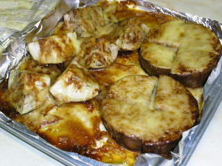 【使った道具】 フライパン アルミホイル オーブントースター 【材料】 茄子 2本 甜面醤 適量 ピザ用チーズ 適量 コショウ 少々 揚げ油 適量 【作り方】 1、茄子を輪切りにし、十字の切込みを入れ、180℃に熱した油で軽く素揚げします。 2、揚げた茄子をホイルの上におき、甜面醤をぬり、チーズとコショウを振りかけます。 3、オーブントースターで強火3〜5分かければ出来上がりです。 |