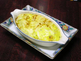 【使った道具】 グラタン皿 小型ボール 【材料】 平餅 2個 ベーコン 1枚 モッツァレラチーズ お好み(大体一握り程度) 牛乳 20〜30cc 生クリーム 適量 パセリやバジル 少々 A 塩 少々 コショウ 少々 粉末コンソメ 少々 卵 1個 【作り方】 1、平餅・ベーコンを一口大の大きさにカットし、グラタン皿に敷き詰めます。 2、ボールにAをいれ、良くかき混ぜます。 3、グラタン皿に(2)を流し込み、モッツァレラチーズを振りかけます。 4、オーブントースターで強火8〜10分ほど焼き目が付くまで焼けば、出来上がりです。 |